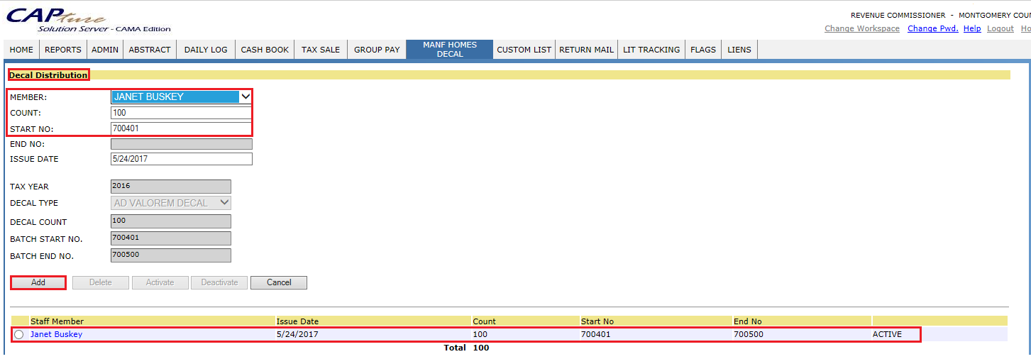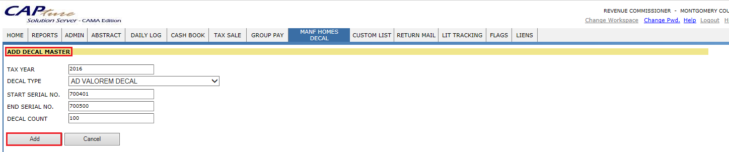 Step 3: Fill the information like Tax Year, Decal Type, Start Serial no, End Serial no, and Decal Count and then click on Add.