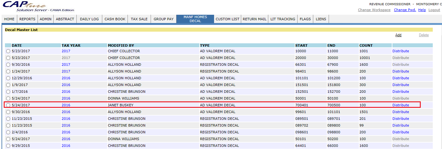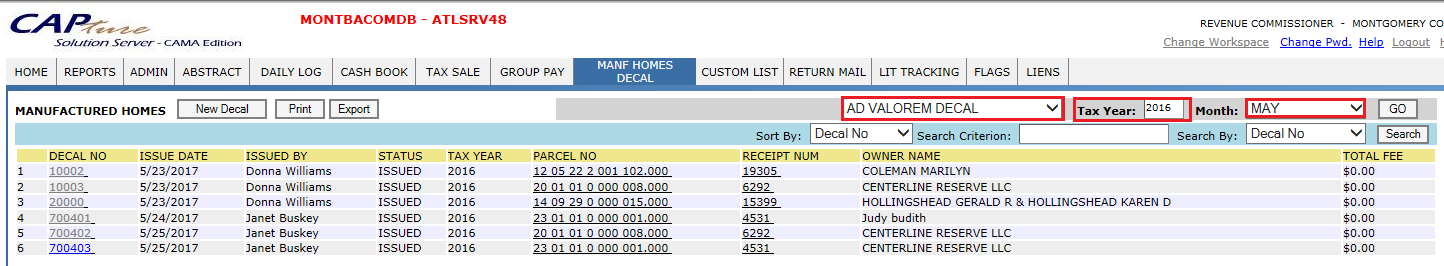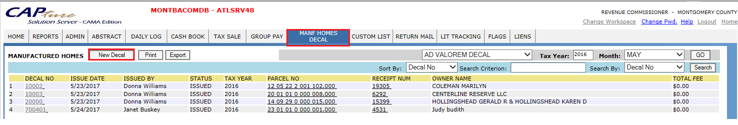 Step 10: User can see the Issued Decals in Manufactured Homes page. User can get respective records by selecting the tax year, month and Decal Category.