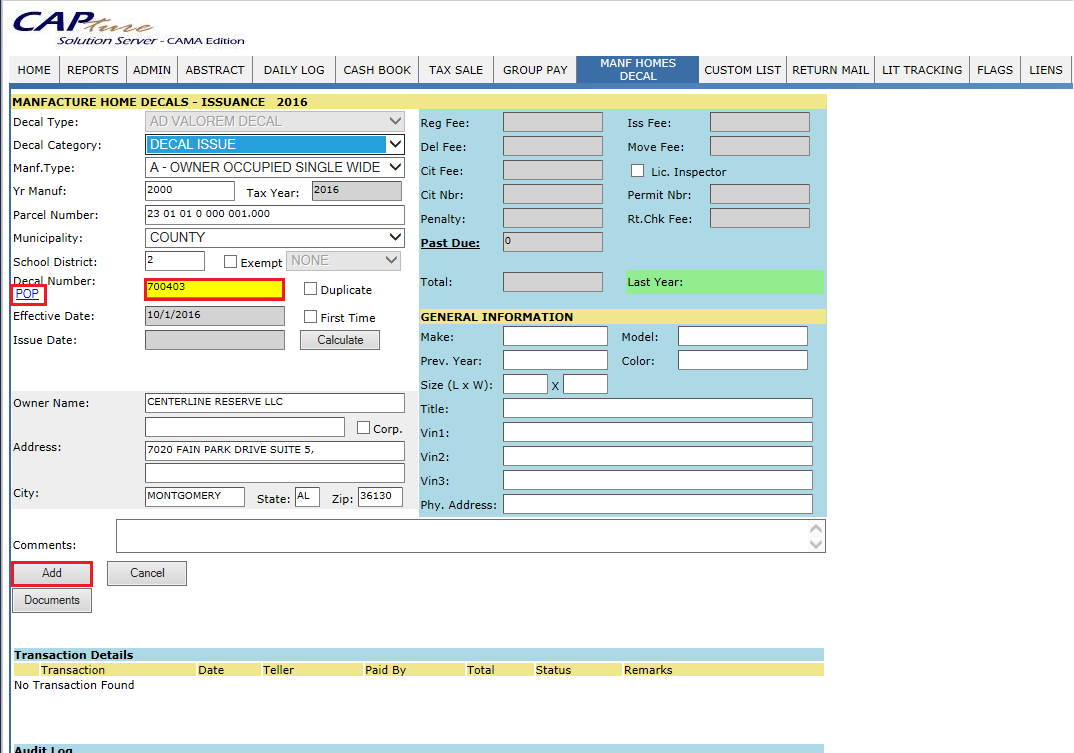 Step 9: While Issuing the decal, by Clicking on Pop Hyperlink, User will get the decal number automatically based on the start no. which was assigned while creating the batch. Fill the information like Decal category, Manf.Type, Year Manufacture, owner information etc. And then click on Add to issue the Decal.